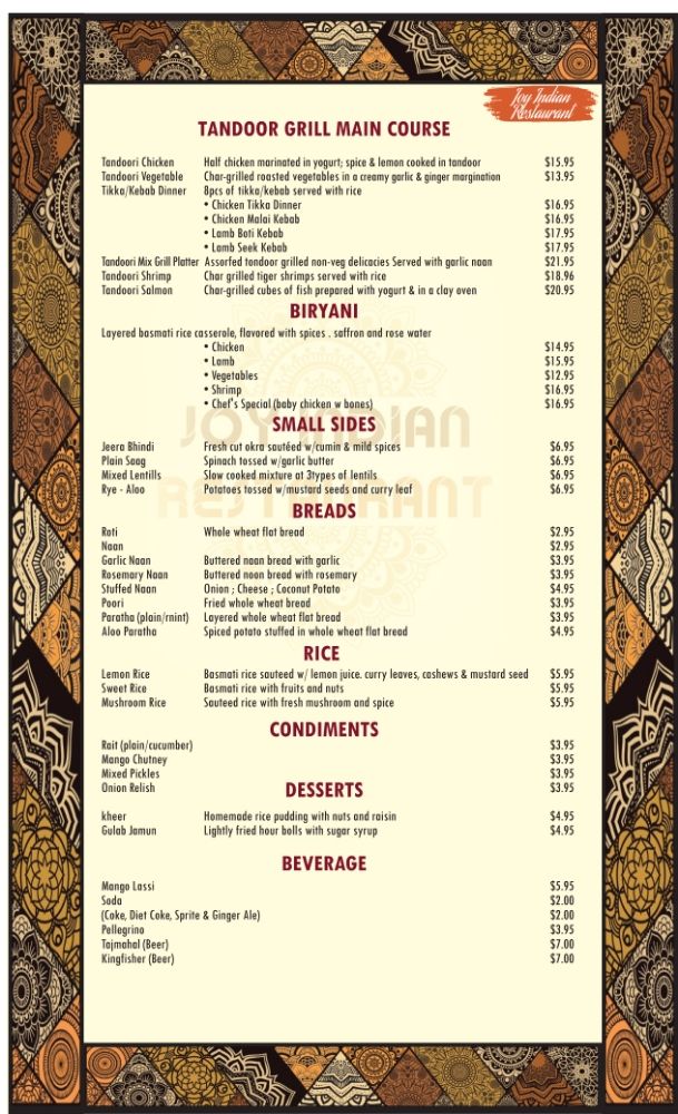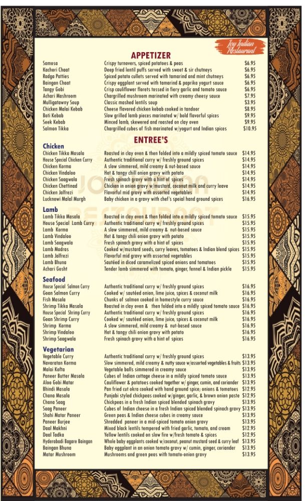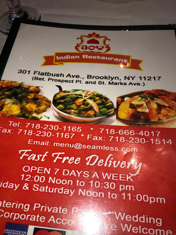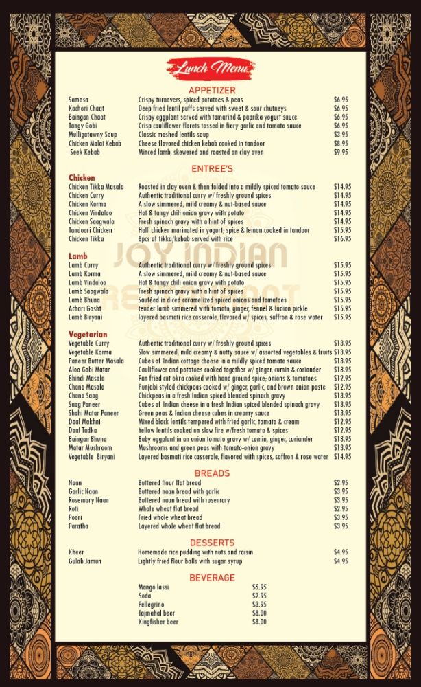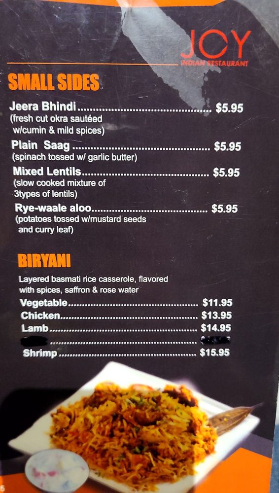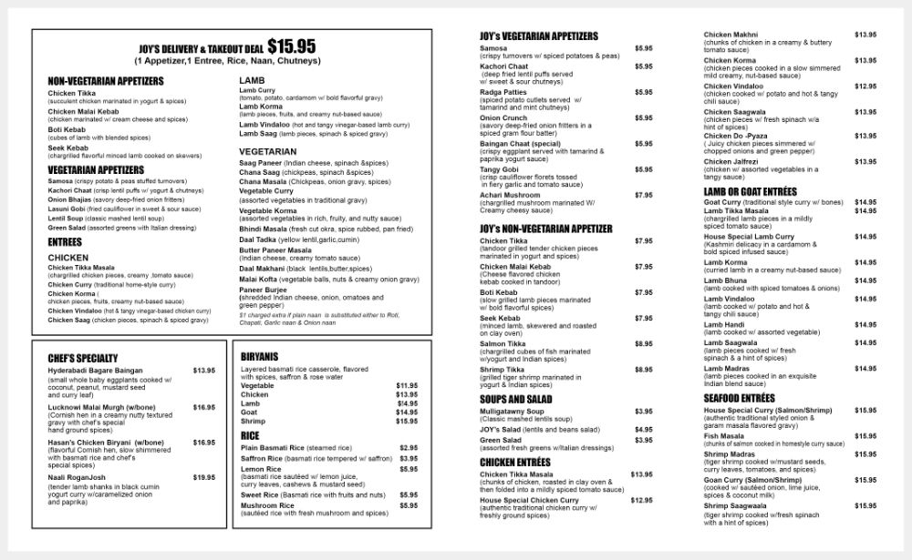 Introducing the menu at Joy Indian Restaurant - a gem in Brooklyn offering a wide range of authentic Indian dishes. Joy's Special Deal is a must-try, including your choice of appetizer and entree served with rice, naan, and chutneys for $19.95. Vegetarian options like Samosa, Kachori Chaat, and Aloo Tikki Chaat showcase flavorful ingredients and spices. Non-vegetarian delights include Chicken Tikka and Boti Kebab, cooked to perfection in a tandoor. Customer reviews rave about the quality and consistency of the food, with dishes like Goat Curry, Chicken Tikka Masala, and Chicken Biryani receiving high praise. The restaurant offers a casual dining experience with options for takeout, delivery, and catering. With a variety of amenities like outdoor seating, wheelchair accessibility, and a happy hour, Joy Indian Restaurant is a must-visit for lovers of authentic Indian cuisine.